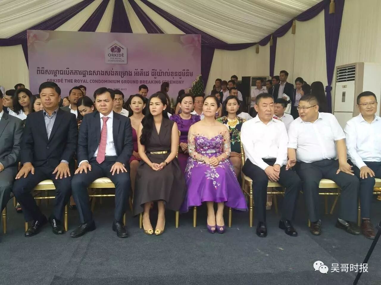 项目总承包方中国建筑第二工程局总经理程贵堂、副总经理孙占军、中国建筑(东南亚)有限公司董事长张宗硕、总经理赵志海、投资方ORKIDE VILLA有限公司董事长洪玛丽、执行董事长乔索喜丽等两家公司高层以及多名社会知名人士出席了开工仪式。